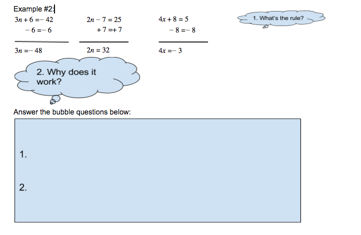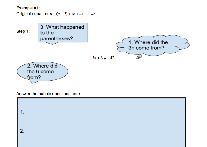 A bubble worksheet is designed to ask questions about an example problem in order to help students learn the process. They work together in groups to answer the q